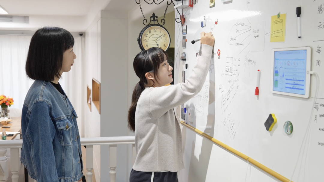 邱羽墨(右一)与妈妈徐琳(左一)在小白板前讨论开发思路。