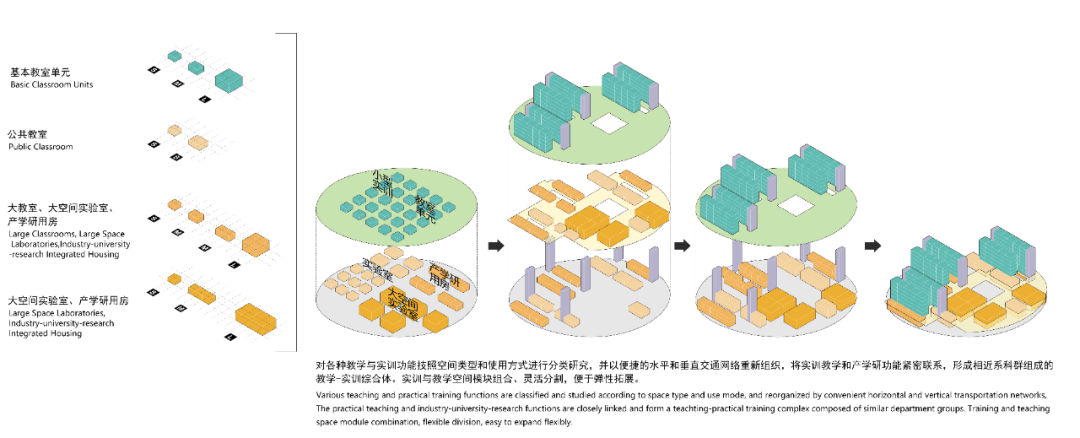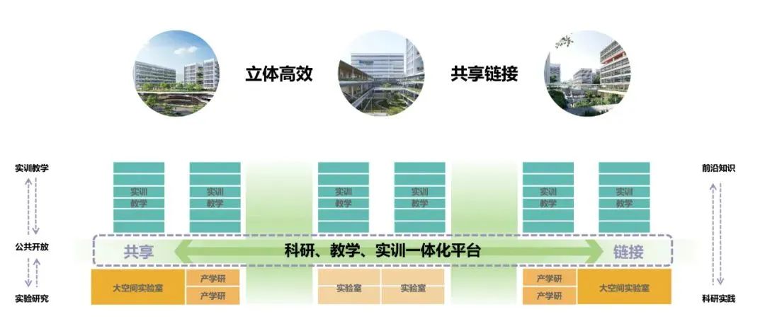 项目注重职教模式创新,利用垂直分层模式,形成底层岛状共享实训平台和上部实训楼组成的实训组团模式,功能布局强调模块化、弹性化特点,适应教学功能和模式的多样变化。