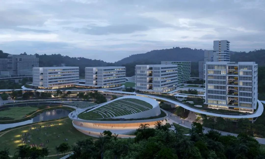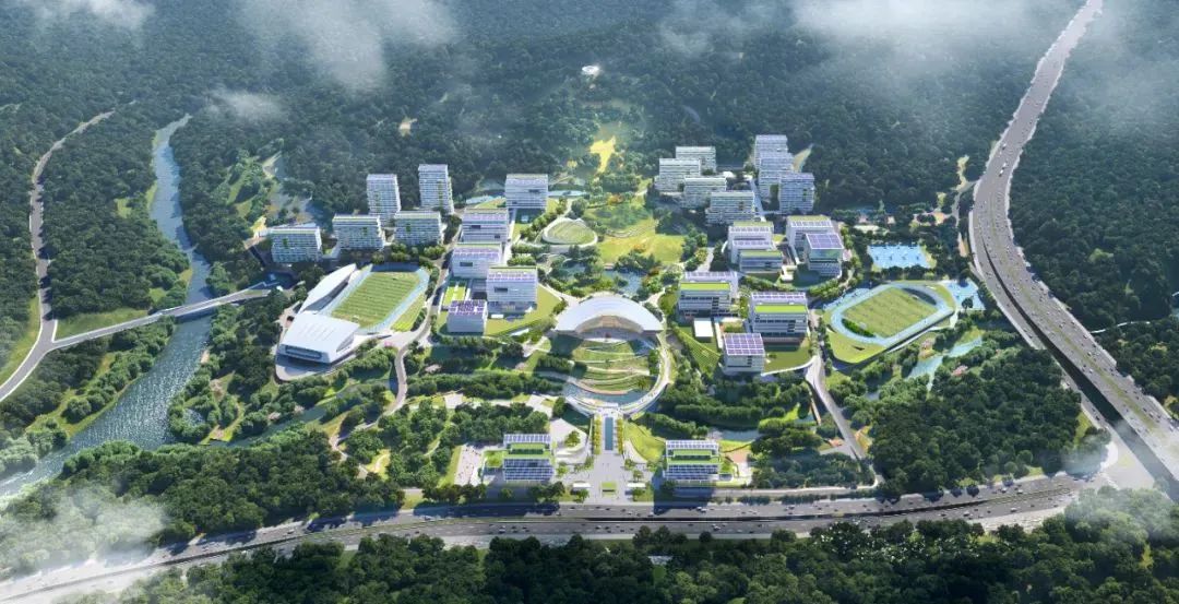 方案依托基地内外得天独厚的自然生态本底,以岭南建筑文化中人与自然和谐共生为核心设计理念,因循就势,因地制宜,采用开阖相宜、集约紧凑的“浮岛式”组团化的布局策略,通过理势—融山—立轴—浮岛—梳络—营水—筑园等一系列设计操作,塑造依山滨河、蓝绿交融、生态优先的自然山水校园格局。