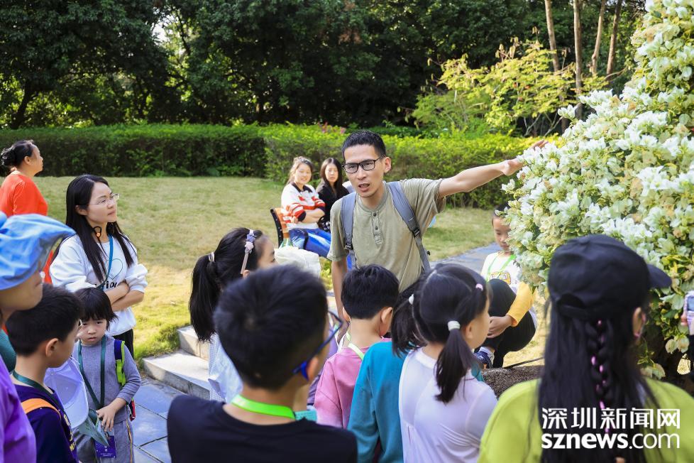 在郁郁葱葱的城市森林,当然少不了自然生态导赏活动。少年科游荟项目特别设置了“畅享绿美南山”自然教育角,邀请深圳市坝光自然学校荣誉副校长、深圳大学生命与海洋科学学院客座讲师马海鹏,带领亲子家庭开展“city walk”,探寻藏在森林中的微观生态系统,认识千奇百怪、绚丽多彩的植物;还特别设置了“畅享绿美南山”生物多样性导赏活动,邀请小志愿者刘卓远担任导赏员,带领亲子家庭走入簕杜鹃绽放的“拱门”,从各类动植物摄影照片中了解水保园的生物多样性。