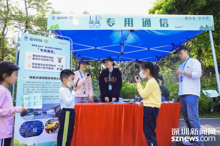 在“专用通信”摊位前,青少年被一部部最新款的防爆对讲机、警用对讲机紧紧吸引住目光,在工作人员指引下一步步体验使用对讲机进行通话。“感谢南山区科协与少年科游荟项目组织的科普游园会,让专用通信走进了青少年和民众中”,海能达通信股份有限公司科普负责人介绍道。