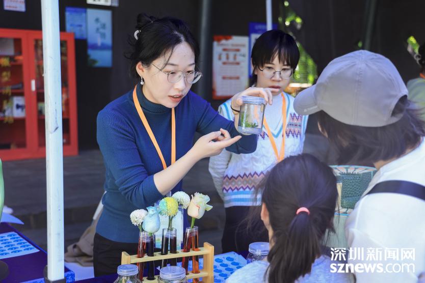 “植物茎是由哪些组织构成的?”在深圳植慧科技产业有限公司“植物密语”摊位前,工作人员运用植物介绍模型详细地展示了植物构成,并通过植物染色实验向亲子家庭普及植物干细胞广泛应用和技术转化成果。