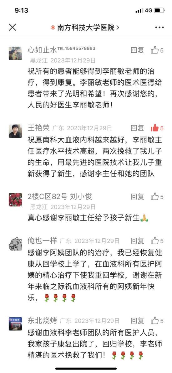 近日,在南方科技大学医院官微的一篇推文后面,来自全国各地的血液病患者及家属纷纷留言,讲述向该院血液内科主任李丽敏求医的经历和感受,字里行间洋溢着感恩和祝福。