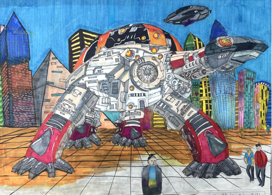 七年级绘画评价活动以“科技与美术”为主题,以小组合作的形式,讨论并选择最佳创意方案草图设计,选取美术材料,共同创作一副科幻画作品。以此发挥学生集体的创意思维,关注科学前沿技术的发展。