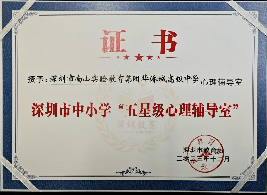 “深圳市中小学星级辅导室”评选由深圳市教育局组织开展。经过市教育局专家答辩和实地考察等环节,华侨城高级中学虹桥心理中心获评第一批深圳市中小学星级心理辅导室。