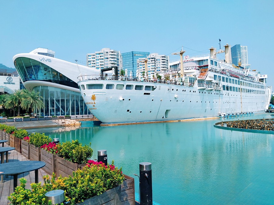 可以看巨型轮船、音乐喷泉、展览,吃美食的地方,坐在艺术中心的草地上,吹着海风,非常治愈。