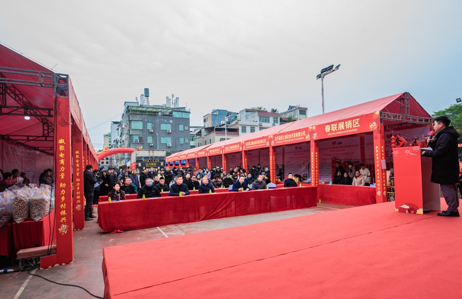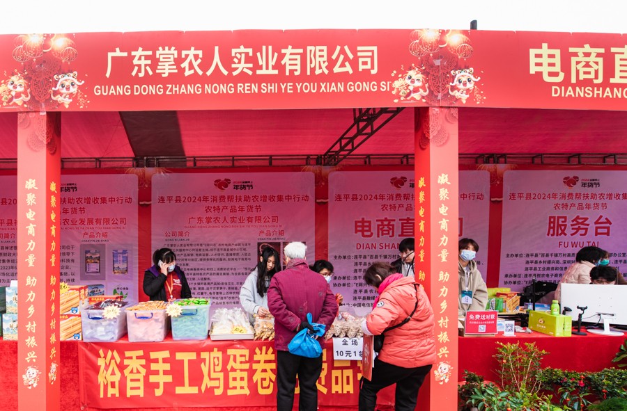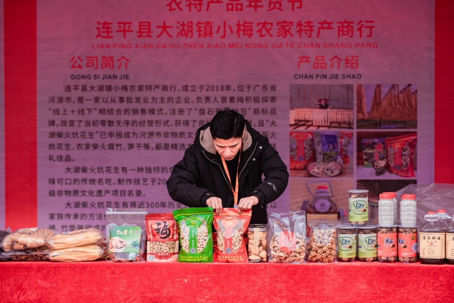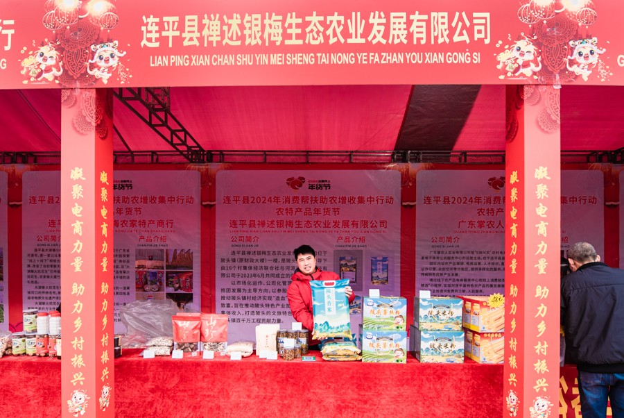 2024年1月26日,广东连平,连平县2024年消费帮扶“百千万工程”农特产年货节暨农特产深圳南山直通车发车仪式在县城体育中心羽毛球场举行,年货节现场共有22家连平本土的农产品、商超企业参展。