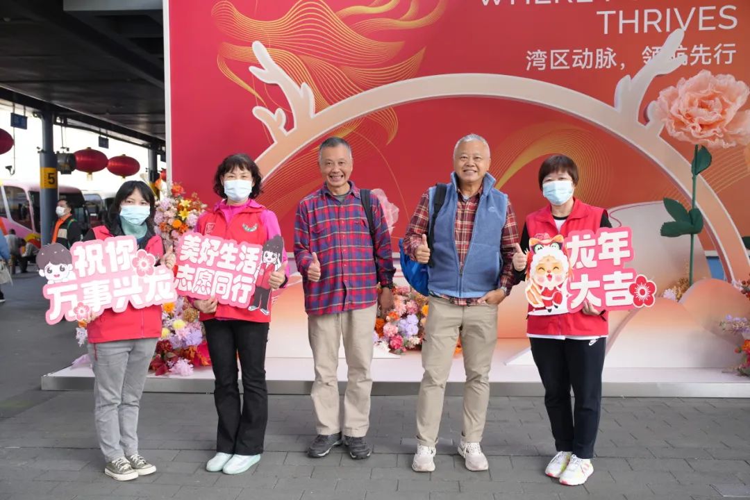 “这里有免费巴士搭乘是吗?”深圳湾口岸入境处,两位香港大叔正咨询如何搭乘免费巴士前往南山各个消费场景,还热情邀请帮他解答问题的志愿者合影留念。