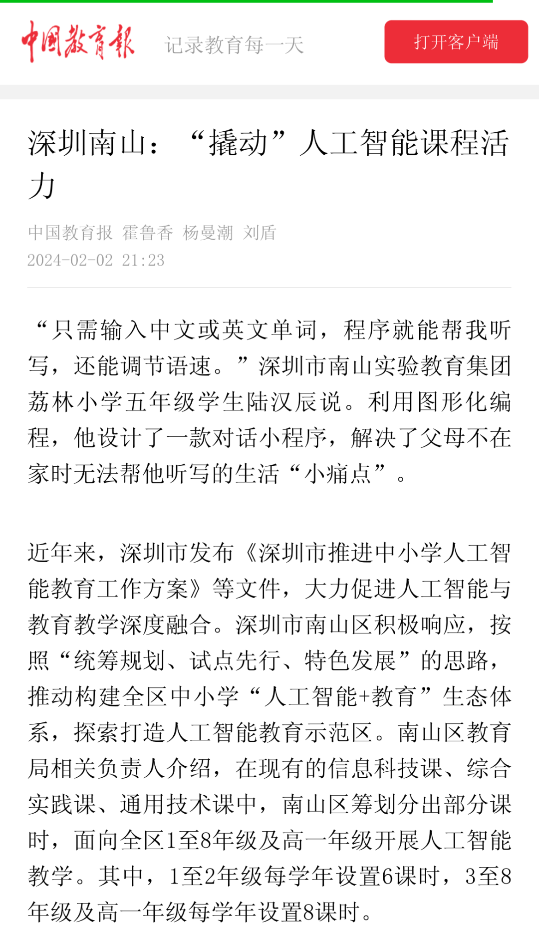 近年来,深圳市发布《深圳市推进中小学人工智能教育工作方案》等文件,大力促进人工智能与教育教学深度融合。深圳市南山区积极响应,按照“统筹规划、试点先行、特色发展”的思路,推动构建全区中小学“人工智能+教育”生态体系,探索打造人工智能教育示范区。南山区教育局相关负责人介绍,在现有的信息科技课、综合实践课、通用技术课中,南山区筹划分出部分课时,面向全区1至8年级及高一年级开展人工智能教学。其中,1至2年级每学年设置6课时,3至8年级及高一年级每学年设置8课时。