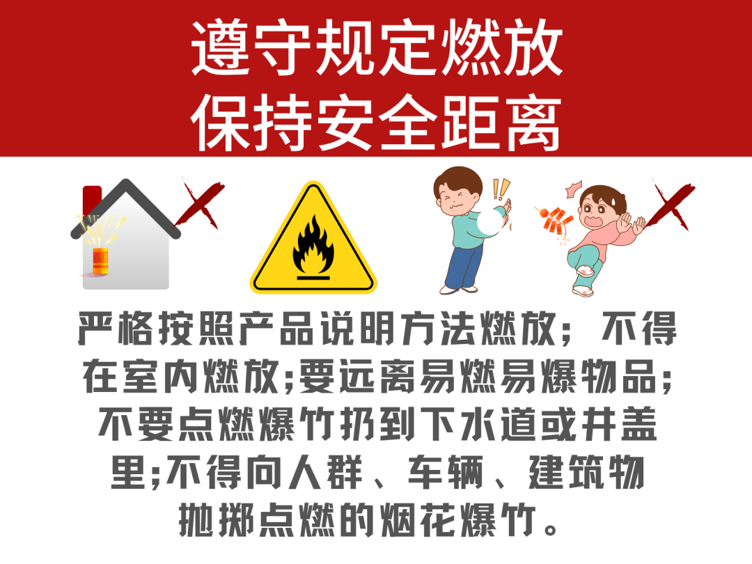 在禁止燃放烟花爆竹的时间、地点燃放烟花爆竹,或者以危害公共安全和人身、财产安全的方式燃放烟花爆竹的,由公安部门责令停止燃放,处100元以上500元以下的罚款;构成违反治安管理行为的,依法给予治安管理处罚。