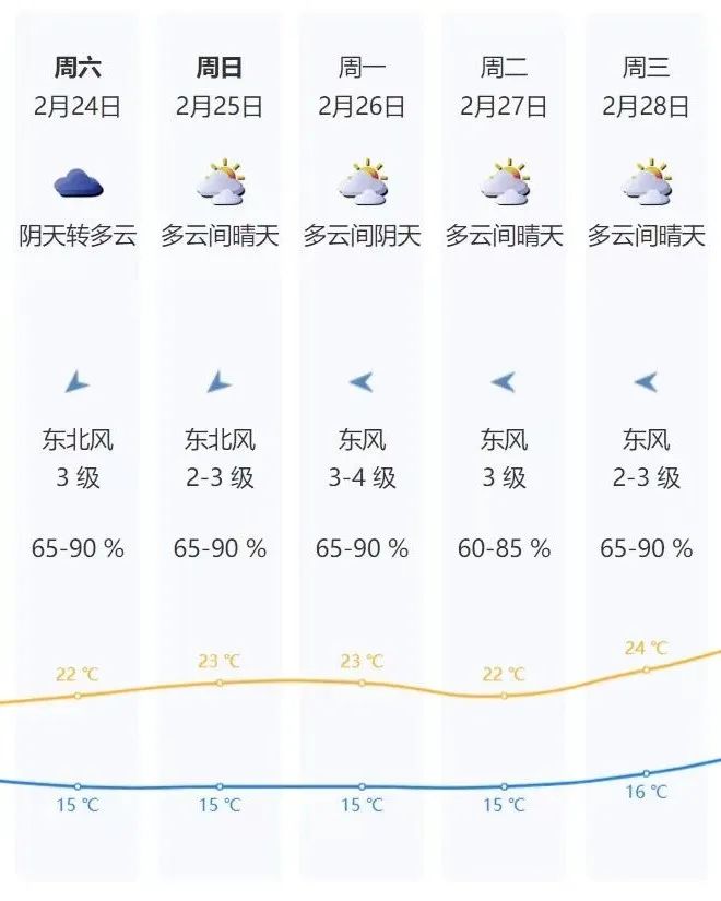 预计22日夜间-23日我市阴天有分散小雨,沿海和高地最大阵风加大至6-7级,23日气温降至16-21℃,天气转清凉;24-27日大致多云,气温15-22℃,早晚天气持续清凉。