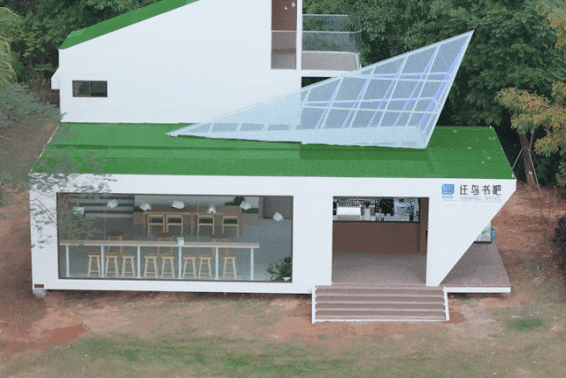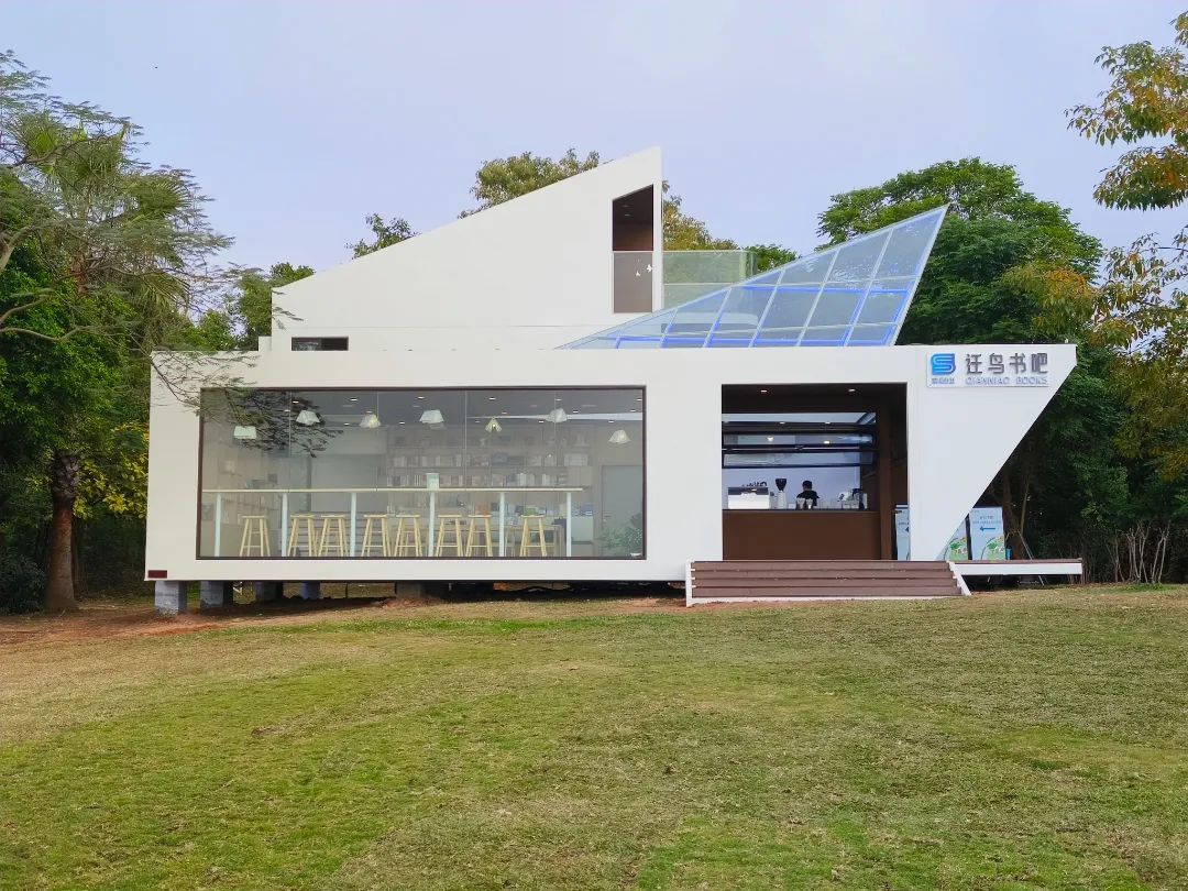 迁鸟书吧位于深圳湾公园中湾阅海广场内,由6个模块组合而成,采用可移动性模块化装置,在不破坏公园绿地的前提下,对公园绿地空间进行灵活利用,是公园书吧品牌的一大创新。室内总面积约120平方米,以白色为基调,木色点缀其中,与周围的绿树、蓝天、大海相得益彰,体现了科技与自然的融合。