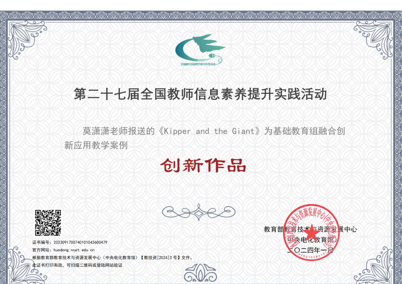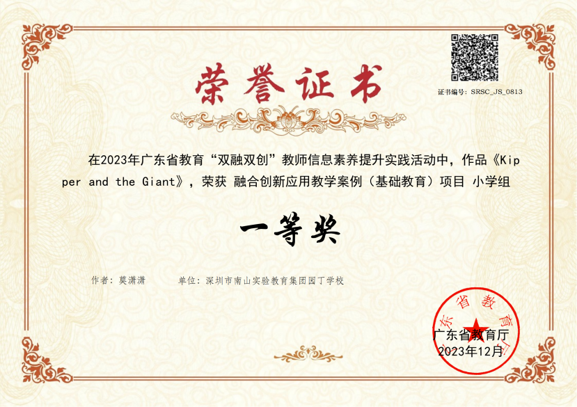 活动中,南山实验教育集团园丁学校莫潇潇课例荣获教育部第二十七届全国信息素养提升实践活动基础教育组融合创新应用教学案例“创新作品”,该作品同时获得2023年广东省“双融双创”教师信息素养提升实践活动融合创新应用教学案例(基础教育)小学组一等奖。