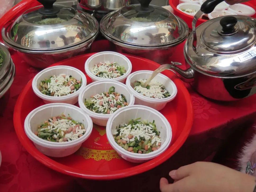 “开丁茶”是一种饭食,一般选取菠菜、芹菜、豌豆、冬菇、木耳、粉丝、芝麻、花生米、爆米花、元贝等13种材料,或煮、或蒸、或炒,做熟后拌在一起,并熬制鲜美的肉汤作为茶水。凡来客,盛一碗菜肴,加入肉汤茶水,便成鲜美的“开丁茶”。看似简单的一碗菜茶,却让人食指大动,尝完仍齿颊留香、意犹未尽,而蕴藏其中的乡情乡愁和祝福情怀亦如茶香绵延。
