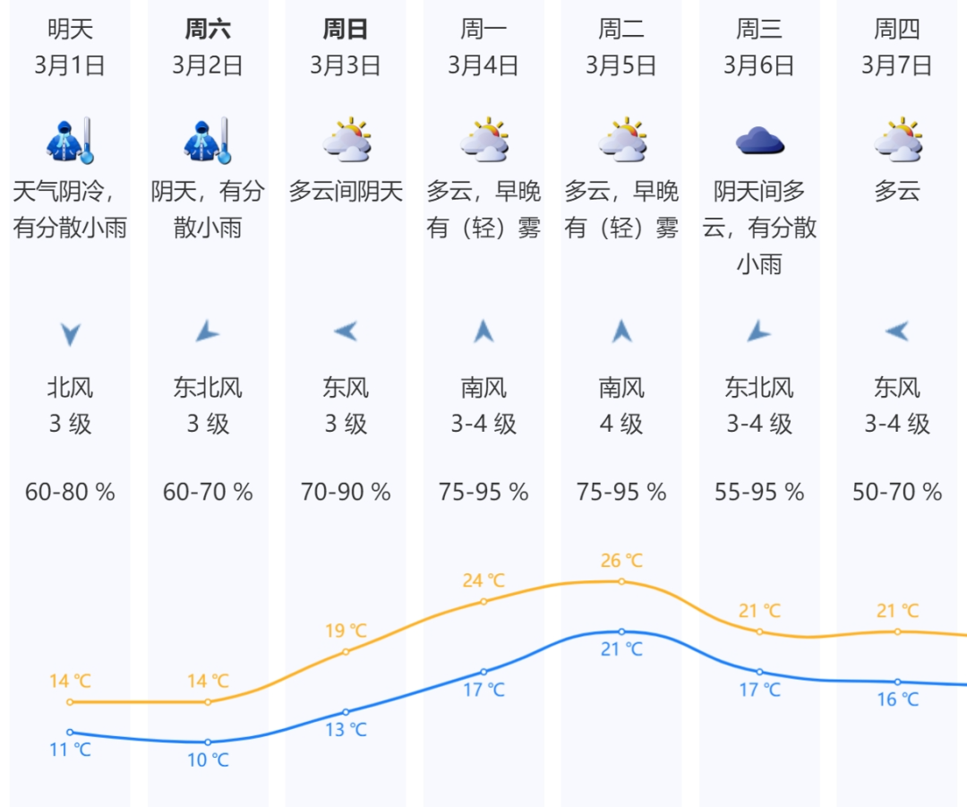 3月1-2日受冷空气影响,间中有分散小雨,最低气温南部降至10℃左右,中北部降至9℃左右,天气转阴冷。