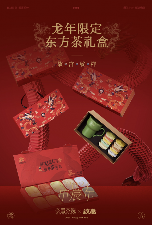 咖啡茶饮品牌与中国文化结合,奈雪的茶与《故宫纹样》打造别具东方香韵的“吉祥茶”,故宫角楼咖啡带来龙点睛奶茶;星巴克联动《大闹天宫》感受独有的神话主题;瑞幸咖啡与贵州茅台再度合作推出“龙年酱香巧克力”品味不一样的甜蜜,传播中国文化。冰淇淋品牌在春节期间玩转“龙”元素和中国文化,DQ推出“赢麻了蛋糕冰淇淋”把麻将牌做成了甜品“發”字寓意发财,把好彩头吃进嘴里;哈根达斯推出灵龙献瑞冰淇淋,颜值口味双在线。烘焙品牌更是各个大显身手,北京稻香村推出“福龙饼”,饼面印有的翔龙图案出自当代艺术家韩美林之手,刷水绘画技巧让画面更具质感;好利来推出盘龙造型的黄油芝士盘龙酥、玉玺造型的芝巧龙玺,好运长龙芝士酥则拥有“全须全尾”的龙身造型和祥云礼盒,草莓慕斯蛋糕在翔龙造型的提手包装点缀下也有了“好灯龙”的新名字。