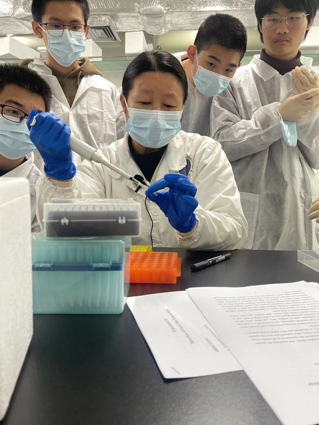 考虑到PCR实验中间需要等待一个半小时,余春红老师先指导了具体的操作,再讲授PCR实验原理。由于实验的很多操作要用移液器加入1μl如此微量的液体,余春红老师担心同学们的操作不够精确,还逐一对大家的移液器操作进行了指导。