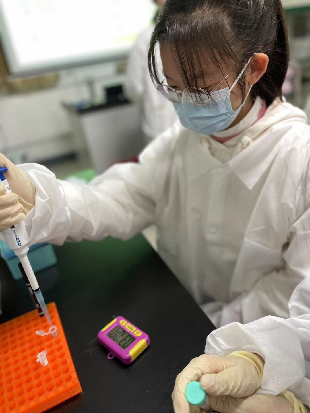 上午,我们完成了小鼠肝脏DNA的提取实验;下午,我们又体验了PCR以及DNA电泳实验。在实验过程中,我们不断地练习移液枪的使用,向小孔中加入微升级的液体。虽然是第一次进入如此专业的实验室、进行如此挑战性的实验,但是在老师的耐心指导下,在同学们的高度专注下,实验圆满完成,收获颇丰!