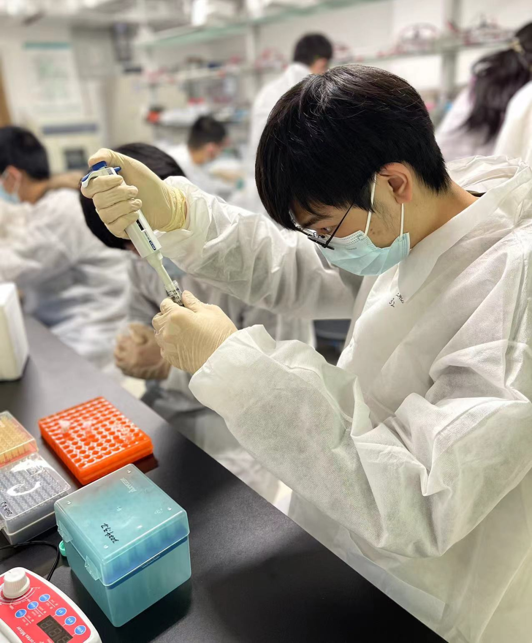 一入实验室,我就被琳琅满目的实验器材吸引了,各式各样的离心机、移液枪、电泳仪、PCR仪以及更多叫不上名的仪器设备,都让我深深感受到高中与大学的硬件差距,全英文授课在老师们的详细指导下也显得不那么困难。在和我的搭档——朱健生的通力合作下,经过一上午的紧张实验,我们成功提取出了小鼠肝脏DNA,并且纯度是最高的,下午的PCR和电泳实验也圆满成功,这无疑是一天中最开心的事!