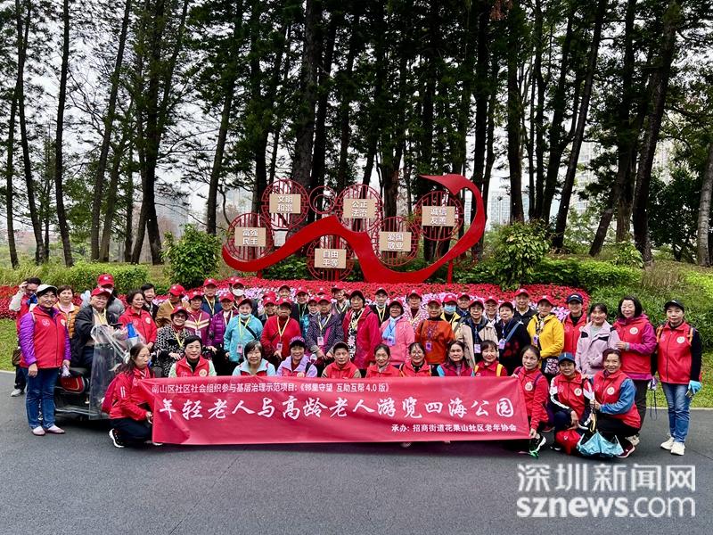 3月11日,志愿者或是推着轮椅或是搀扶,带领40位行动不便的老人游览四海公园。老人们握手寒暄,边走边聊,谈笑风生,好似久别重逢的老友。协会还向老人赠送了太阳帽等户外用品。值得一提的是,95岁的施绍清和85岁的林郁惠夫妇各自驾驶“老人车”参加游园,施绍清激动地说:“深圳了不起!我们感谢党和政府!生活在深圳真好!”林郁惠表示,要把参加活动的照片放大冲印,寄给远在美国的子女,让子女知道他们在深圳生活很好。