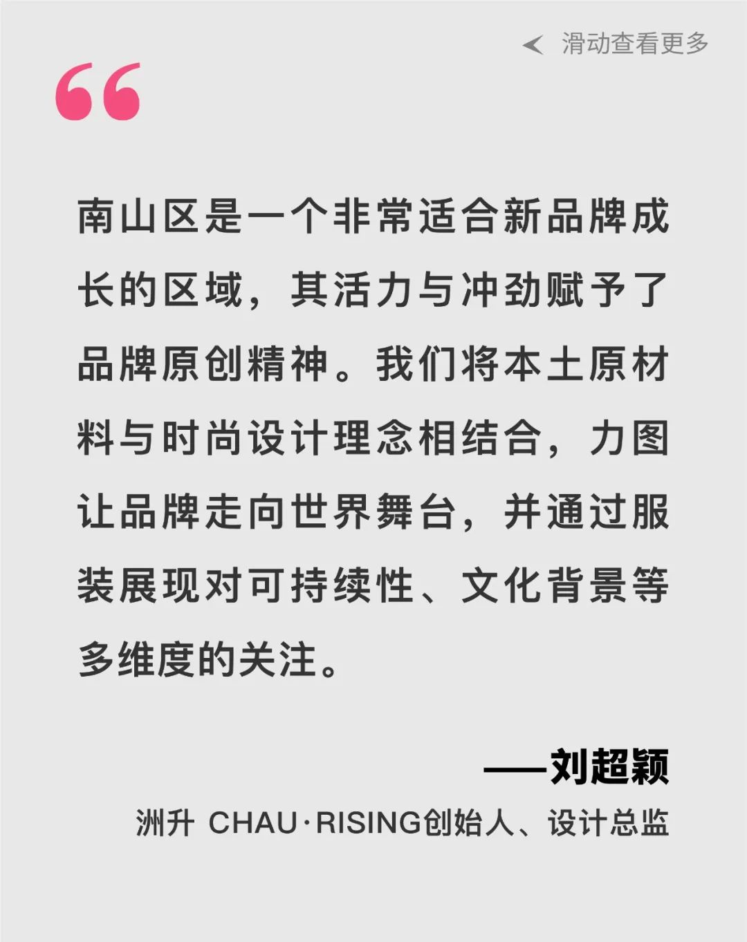 在本次双城时尚周中,以洲升CHAU·RISING为代表的深圳新锐设计师品牌令人眼前一亮,生动诠释出中国当代原创设计的力量,这背后离不开南山对新生代设计力量的精准扶持和持续孵化。