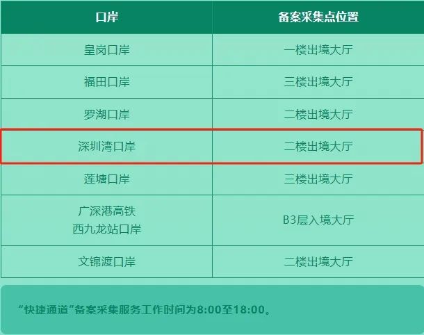 节假日期间,口岸旅客“快捷通道”备案采集点正常上班,为有需要的旅客提供备案采集服务,采集时间为旅检二楼出境大厅东侧8:00-18:00。