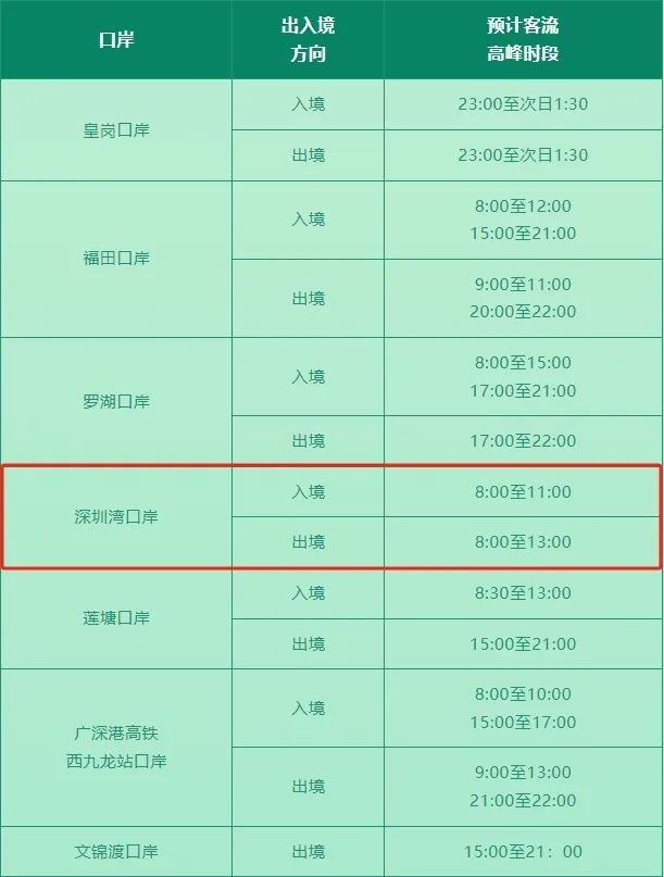 据预测,假期期间经深圳湾口岸出入境的客流将超35万人次;客流高峰时间段主要集中于及4月4日及4月6日,预计8:00—11:00为入境高峰,8:00—13:00为出境高峰。