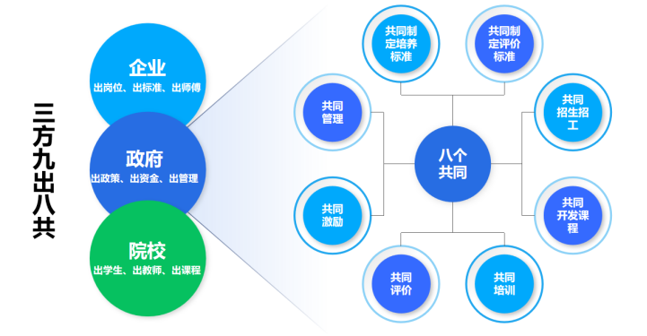 “产教评”技能生态链是指政府、院校、龙头企业三方联动,创新探索“龙头企业出岗位、出标准、出师傅,院校出学生、出教师、出教学资源,政府出政策、出资金、出管理”,企校“共同制定培养标准、共同制定评价标准、共同招生招工、共同开发课程、共同培训、共同评价、共同激励、共同管理”的“三方九出八共”技能人才培养模式。