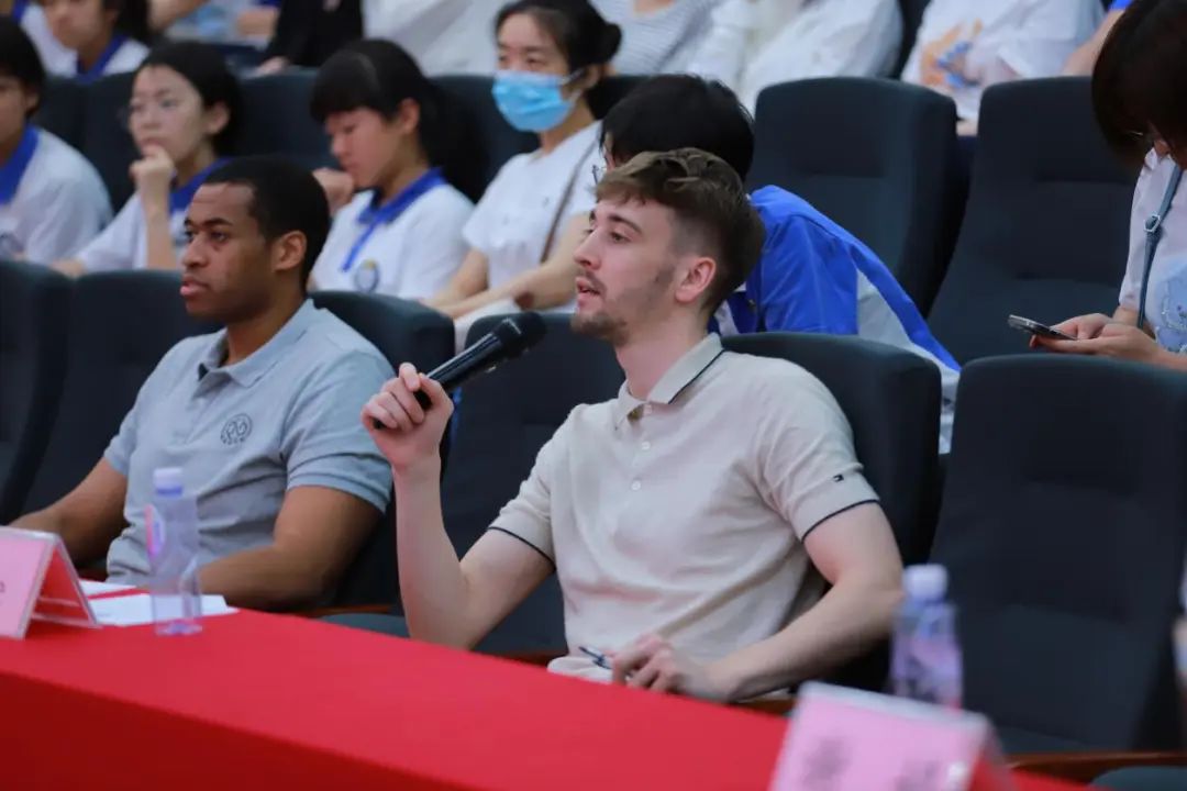 在即兴问答环节,外教评委结合每位选手的演讲内容,精心设计问题,启发选手们思考如何更好地为中国文化代言,帮助拓展学子对于演讲主题的思考,锻炼学子用英语讲好中国故事的能力。选手们的机智应答,展现了南山初中学子的朝气。