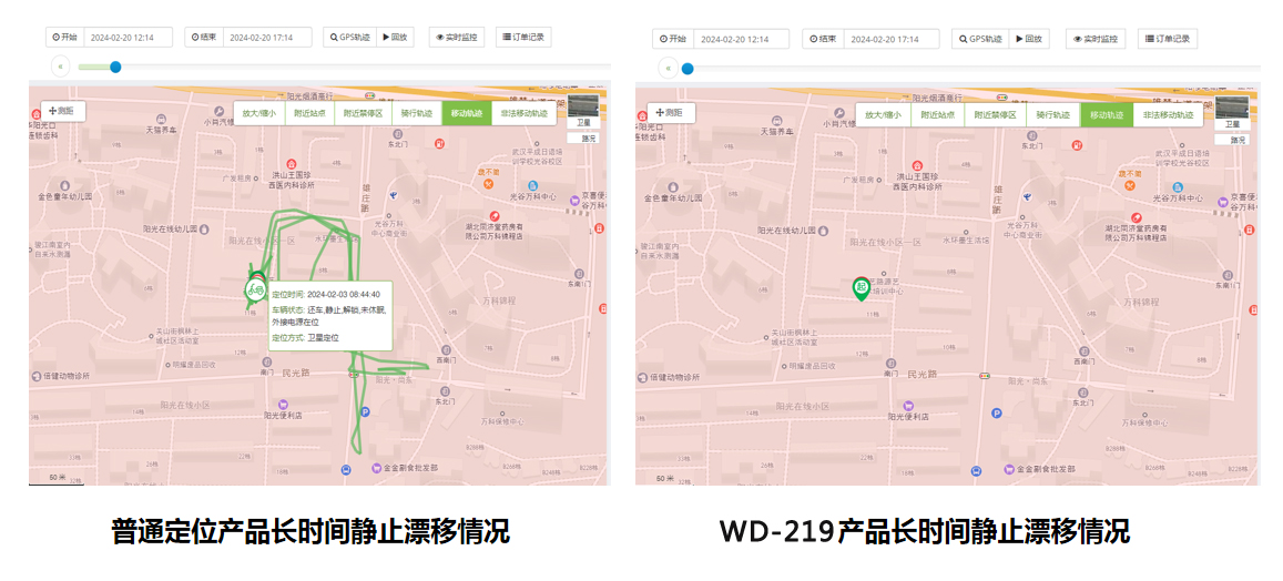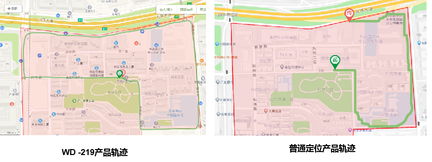通过轨迹对比来看,WD-219相比普通定位产品轨迹更流畅,更精准,不会产生因漂移导致越界误判,而使车辆突然断电的情况,大大提升用户骑行体验。