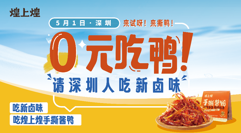 而且这一次的五一假期,为表达对年轻消费者的友好和真诚,煌上煌在深圳发起一场 “0元吃鸭 请深圳人吃新卤味”的大型美食品鉴活动,请深圳人来尝尝这口新卤味。