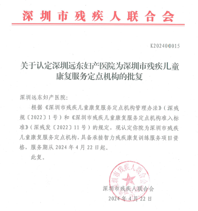 2024年4月22日,对于深圳远东妇产医院儿童保健科来说,是一个可喜的发展里程碑,经深圳市残疾人联合会认定:深圳远东妇产医院为深圳市残疾儿童康复服务定点机构,具备承接具备承接智力残疾康复训练服务项目资格。