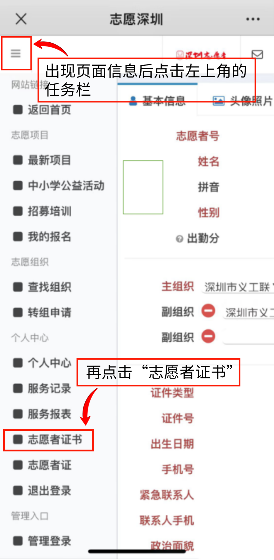 出现页面信息后点击左上角的任务栏,再点击“志愿者证书”