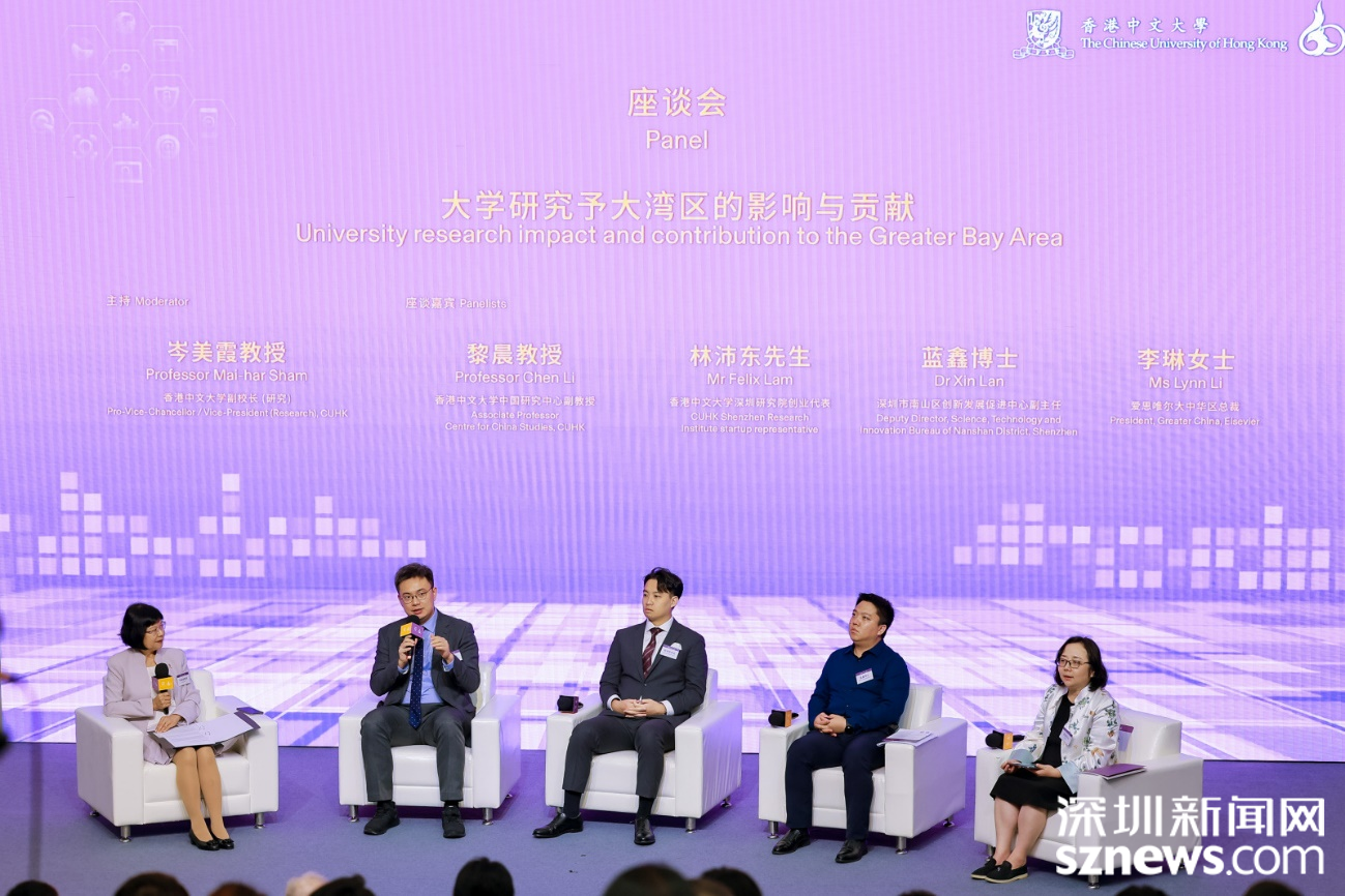 报告发布会中的座谈会以“大学研究予大湾区的影响与贡献”为主题,由香港中文大学副校长(研究)岑美霞教授 (左一) 主持,与香港中文大学中国研究中心黎晨副教授 (左二)、香港中文大学深圳研究院创业代表林沛东先生 (左三)、深圳市南山区创新发展促进中心副主任蓝鑫博士 (右二) 及爱思唯尔大中华区总裁李琳女士 (右一) 就学术科研及创作技术应用的议题进行讨论。