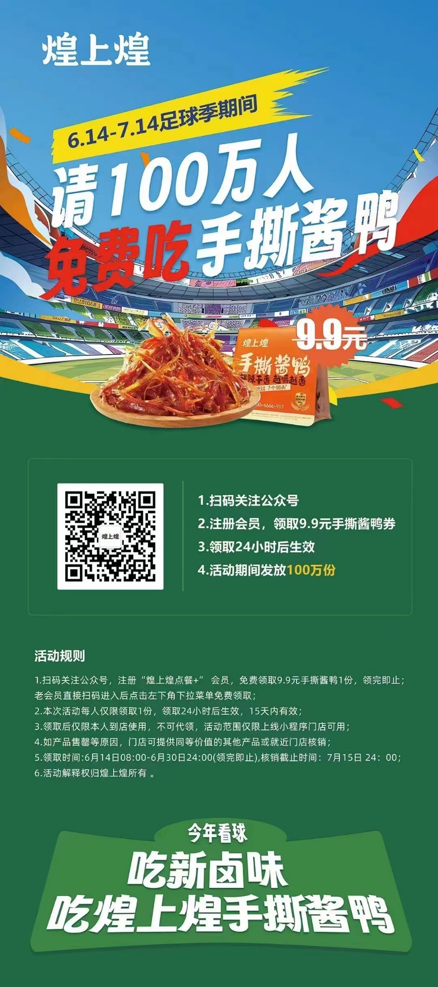 今年看球,推荐一款新卤味爆品,煌上煌手撕酱鸭,球要一起看,鸭要撕着吃。欧洲杯期间,为满足广大球迷熬夜观球场景需求,煌上煌邀你免费吃鸭,采用非遗酱卤工艺,28 味植物香辛料、32 道秘制酱卤工序,72 小时酱制,只选「鸭中贵族」红毛麻鸭为原料,3天酱透,骨头都香,形成了煌上煌“酱辣干香”的独特口味特色,上市爆卖10000000份,10个吃过,7个回头。活动上线后,热销不断,扫码即可免费领取9.9元手撕酱鸭1份,数量有限,领完即止。