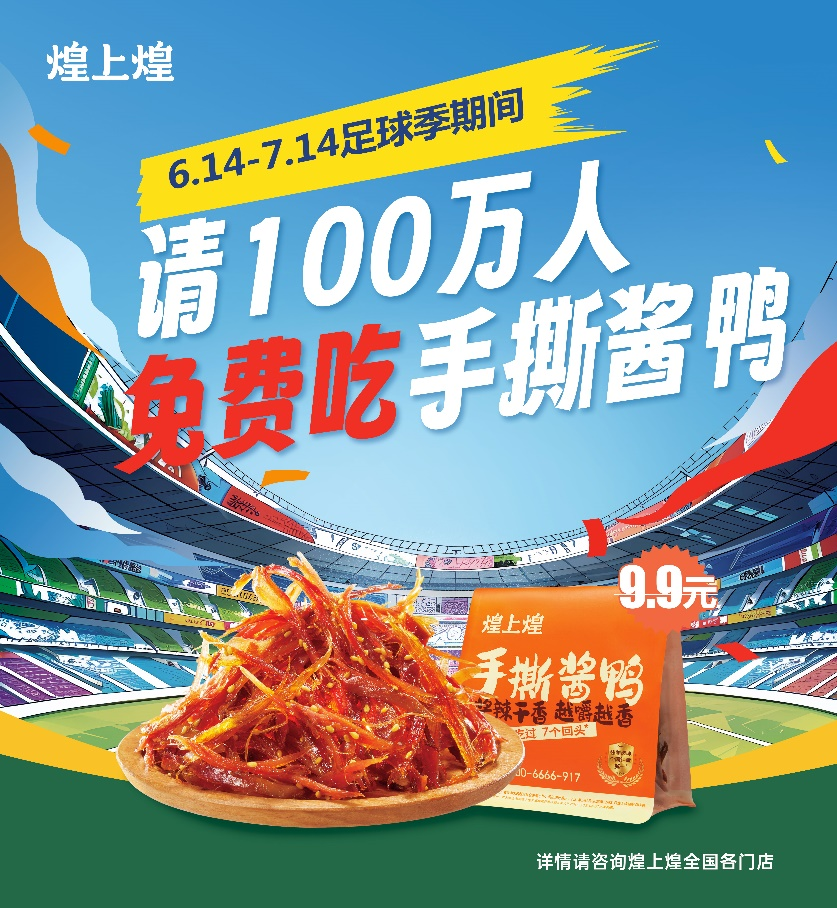 煌上煌中国酱卤第一品牌,也是行业内第一家上市公司,品牌一直用感恩之心回馈消费者,也一直致力于提供更美味的产品给新老粉丝,这个夏天,为梦想,为自己心中的那份热爱助力呐喊,煌上煌手撕酱鸭与你一起开启足球饕餮盛宴,让我们共同期待这场激情燃动的欧洲杯,为足球的魅力而疯狂欢呼!