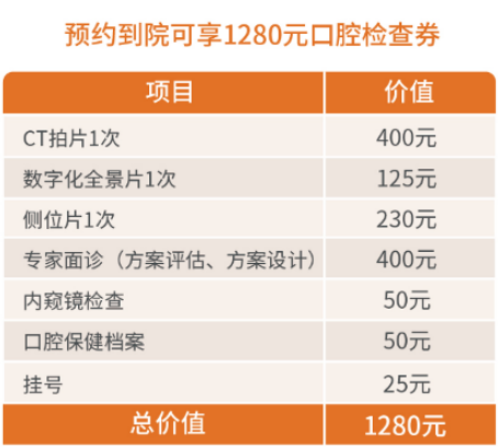 包含CT拍片、数字化全景片、侧位片、专家面诊(方案评估、方案设计)、内窥镜检查、口腔保健档案、专家挂号费全额补助,补助后费用低至0元!