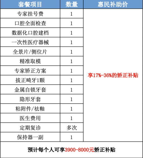 针对龅牙、地包天、牙列不齐、牙缝大等牙齿不齐情况,可享矫牙全品类3900-8000元补贴(覆盖金属矫正、陶瓷矫正、隐形矫正、舌侧矫正)。