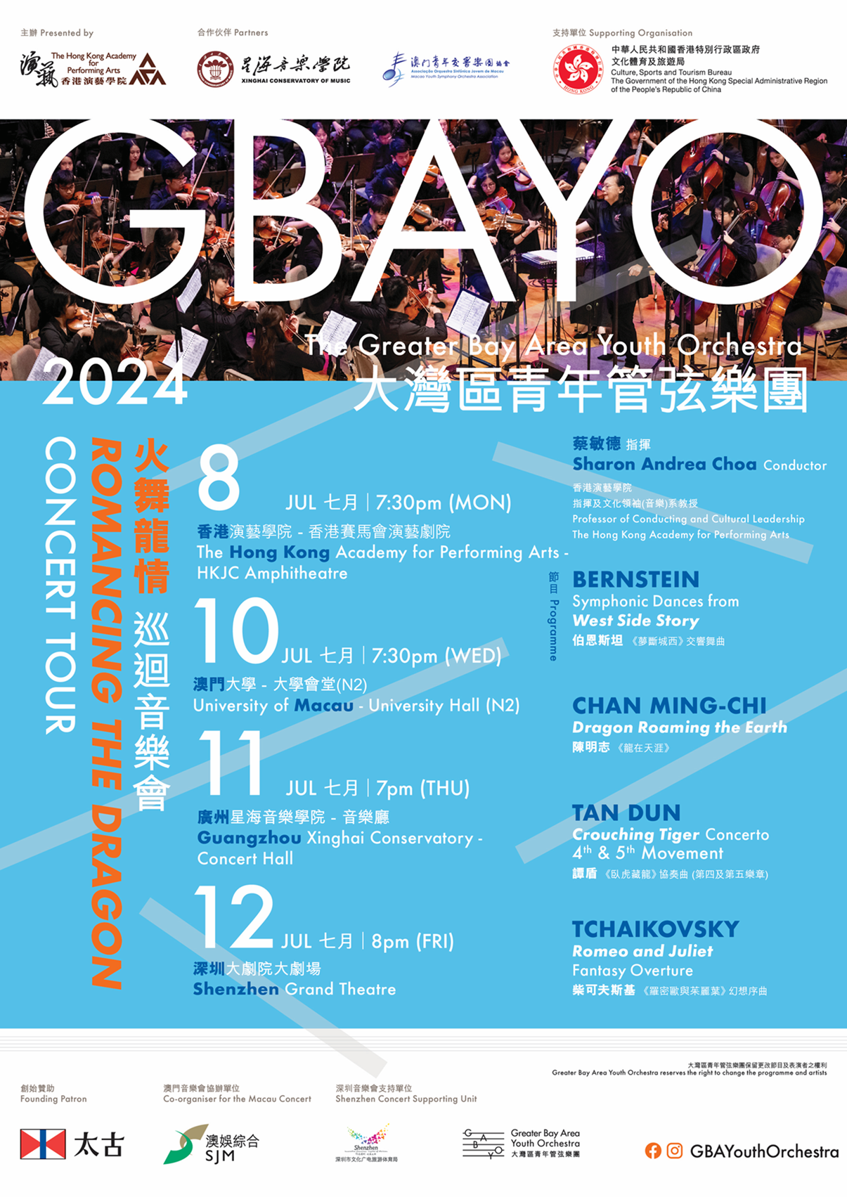 香港演艺学院校长蔡敏志教授表示:“承接去年首演音乐会的成功,很高兴演艺学院音乐学院今年再次与星海音乐学院及澳门青年交响乐团协会携手合作,为大众带来大湾区才华横溢的青年乐手演奏的悠扬妙韵。适逢今年为龙年,龙象征大智大勇、富贵吉祥、非凡成就,因此今年的音乐会名为《火舞龙情》。我们希望通过融合精彩绝伦的古典名曲和当代音乐,呈献一场触动心灵的音乐盛宴,让观众感受到龙的独特精神,及感受音乐带来那份震撼人心的力量。学院秉承培养艺术及文化人才的宗旨,希望利用大湾区青年管弦乐团为才华出众的青年音乐家提供精进造诣、追求最高管弦乐表演水平的平台;并通过世界知名音乐家的专业培训,指导优秀年轻乐手。我在此衷心感谢香港特别行政区政府文化体育及旅游局作为今年大湾区青年管弦乐团计划的支持单位,也特别鸣谢创始赞助太古集团,及其他赞助商和合作伙伴——深圳市文化广电旅游体育局与澳娱综合度假股份有限公司对这次巡演的支持。”