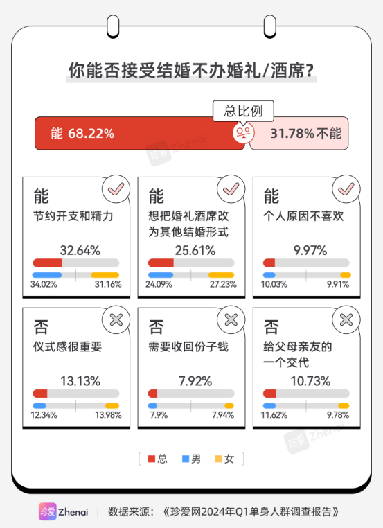 据民政部统计,2023年各地组织集体婚礼活动1625场,服务5.71万人次;开展集体颁证活动近1.2万次,服务40.3万人次。此前珍爱网发布的《婚俗大调查》中也显示,有超六成人(68.22%)表示可以接受结婚不办婚礼。可见,如今,越来越多的青年朋友正在将传统习俗与时代新风密切融合,倡导树立简约适度的婚俗礼仪,让婚姻大事简约“不简单”。
