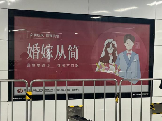 深圳新闻网2024年7月10日讯(记者 吴炳然)推行集体婚礼、低碳婚礼等特色婚礼,倡导树立简约适度的婚俗礼仪;用简朴大方的方式增加婚姻登记的仪式感,告别铺张浪费……各地通过多种形式推进婚俗改革、移风易俗,婚嫁新风尚正逐步形成。近日,“南昌地铁的标语是婚嫁从简”的话题登上微博热搜,引发网友广泛关注。网友们纷纷表示:“这种广告形式很不错,简单平凡的生活也可以很幸福。”