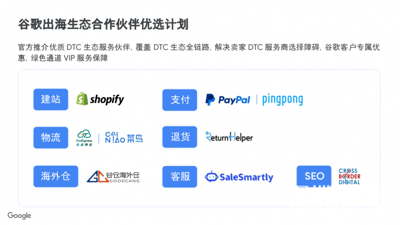 此外,现场还公布了谷歌出海生态合作优选计划,谷歌官方推荐优质DTC生态服务伙伴,覆盖DTC服务全链路,谷歌客户专属优惠及绿色通道VIP服务保障,帮助卖家实现DTC无忧起步。