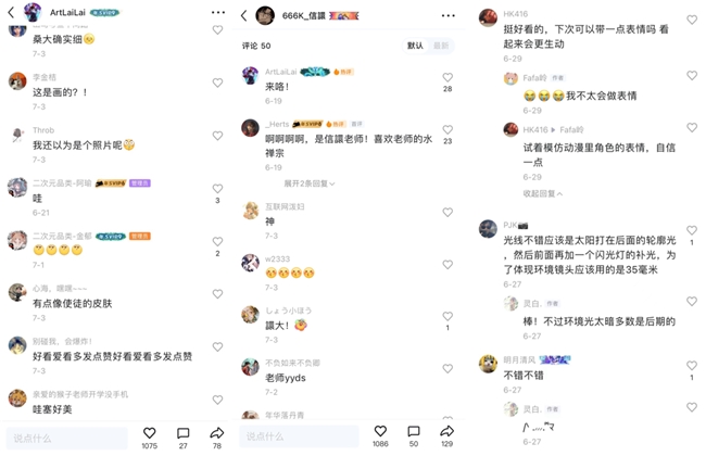 也难怪大佬们的评论区一整个化身“夸夸团”,纷纷表示“好看、爱看、yyds!”给足排面。而懂行的朋友,已经开始细细研究和分析作品的光影手法,并成功引起大佬的注意;还有为创作者提供友好建议和鼓励的发言,一整个暖心住了。