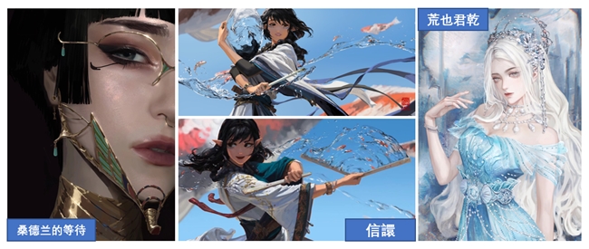 绘画赛道同样不甘落后,冠军获得者、拳头游戏首席插画师信譞老师为其个人项目《赋神》中水禅宗创作的水扇插画,锦鲤跃于激流之上的精妙和律动感让人见之忘俗;亚军荒也君乾老师则以精致细腻的二次元画风见长,画笔下的海之女王让人直呼仙品;季军桑德兰的等待则仿佛是“摄像头画风”,笔下人物真实的皮肤纹理,一时让人分不清是绘画还是cos。