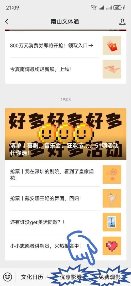 提醒!以上活动,需要先关注“南山文体通”微信公众号,在公众号消息页底部菜单栏找到“优惠影券”“免费观影”按钮,点击后参与抢券、抢票。