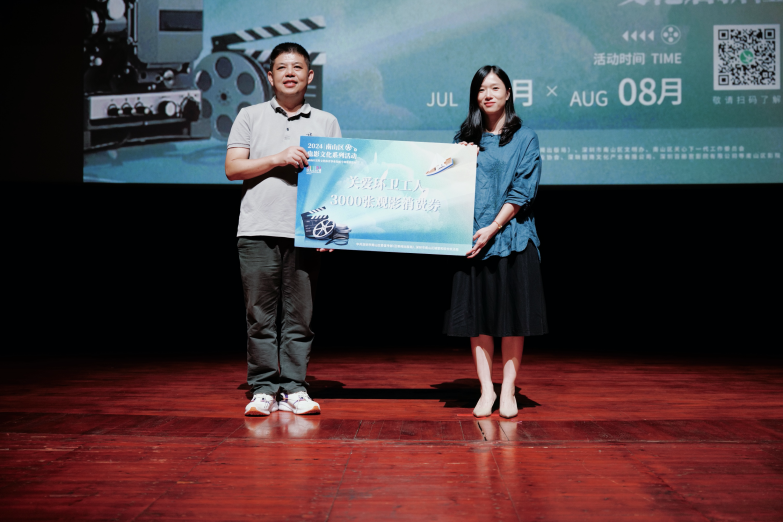 7月26日当晚,“观影献爱心”活动由中共深圳市南山区委宣传部四级调研员符志壮为南山区环卫工人送上了3000张电影消费券,让这些“城市美容师”感受到了社会的关爱,共同传递温暖与关怀。