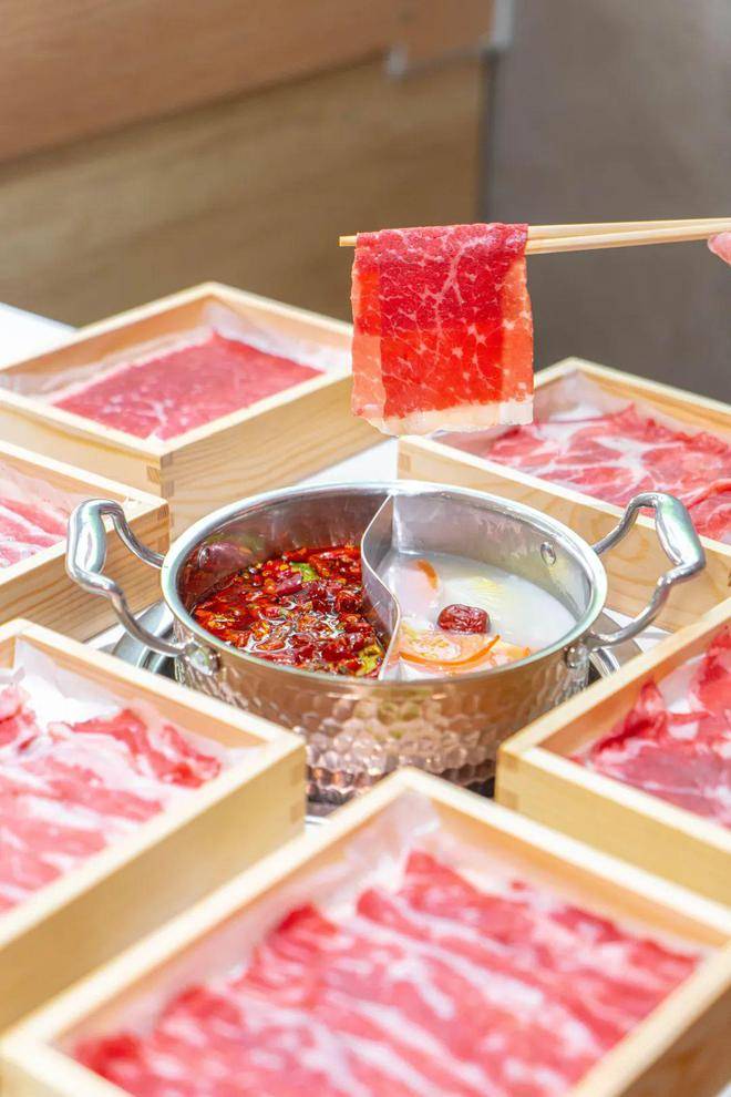 而且不同于很多火锅店的肥牛是“卷”,一围的肥牛是进口冻鲜牛肉,一整块牛肉在门店现点现切,一片片摆在盘子里的,鲜红的纹理,非常新鲜,价值感很高。