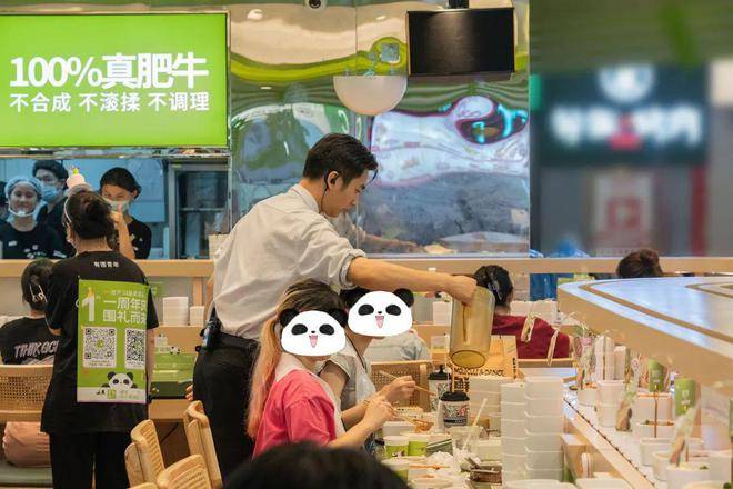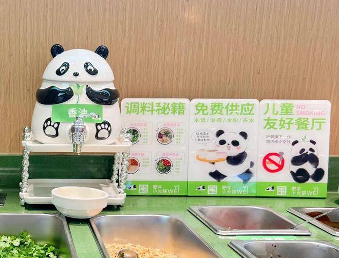 虽然说餐饮业用熊猫做IP的品牌并不少见,但是一围把熊猫这个视觉符号用到了极致:门口粉色腮红的熊猫立牌、熊猫慕斯蛋糕、服务员帽子上趴着个小熊猫、各种熊猫周边……甚至连装香油的瓶子都是熊猫样式。