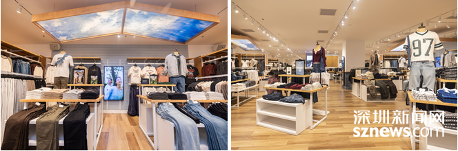 Hollister House全新门店以自然元素为灵感来源,融合了简约的现代设计,为消费者打造出一个舒适与活力并存的购物空间。店内的木质拼色地板,以其自然的纹理和温暖的色调,营造出一种亲切而舒适的氛围。墙面白蓝的拼接带来一种清新的视觉冲击。白色墙面纯净明亮,蓝色部分则采用深浅不一的拼色砖块,这些砖块以不规则的方式排列,呈现出一种动态的美感。抬头望去,Hollister门店空间的天花板也别具匠心,精心设计的灯板映射出棕榈树的图案,使店铺更具阳光活力,让人仿佛置身于假期的悠闲之中。在这充满灵感的店铺中,消费者可以轻松探索Hollister新品,更可抢先解锁早秋时尚穿搭。