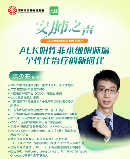 9月19日晚19点,中山大学附属肿瘤医院、副主任医师、硕士生导师洪少东教授将走进北京康盟慈善基金会安肺之声直播间,并将以“ALK阳性非小细胞肺癌个性化治疗的新时代”为主题展开相关知识科普。
